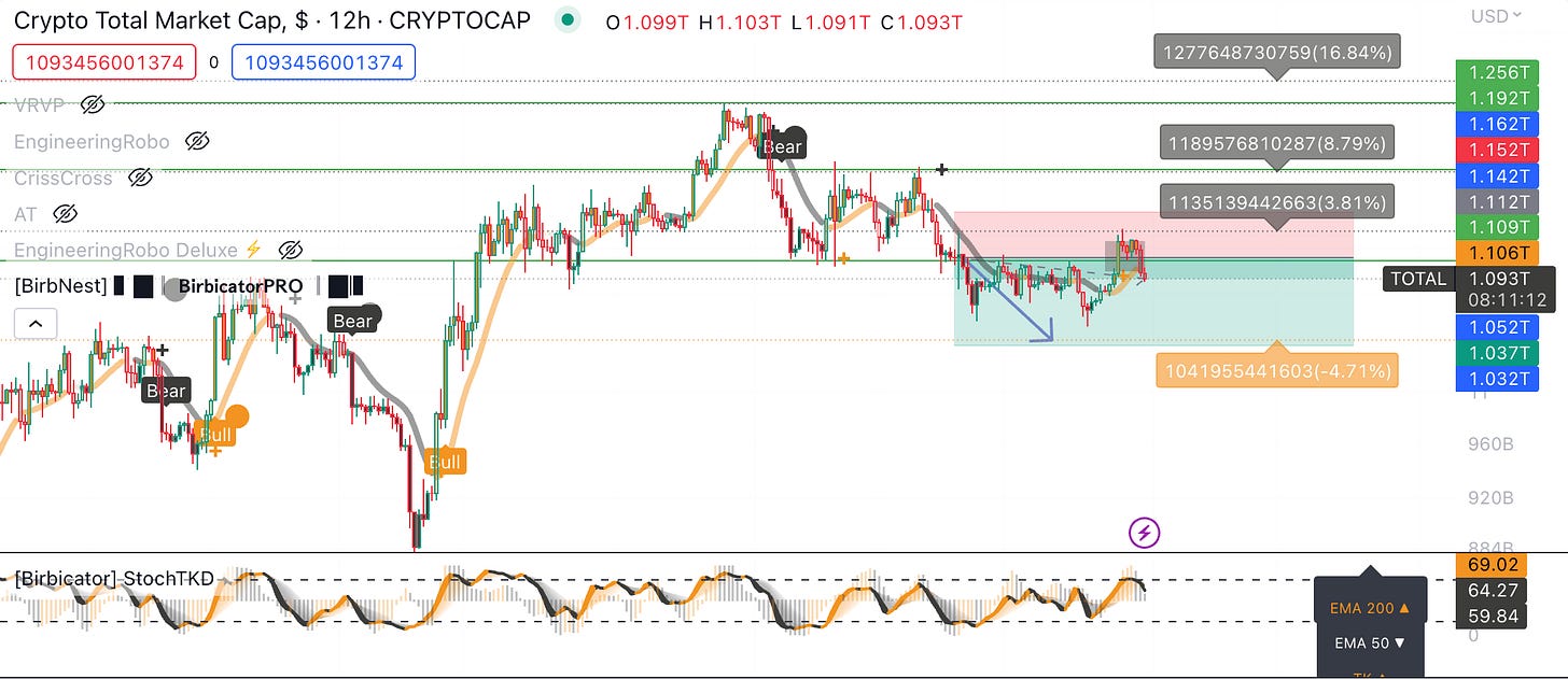 An update to my prediction on the total market cap of cryptocurrencies from two weeks ago. I said the PEPE meme pump had marked the local top of the crypto market caps. Since then the market cap has dropped slightly, following my prediction pretty closely.